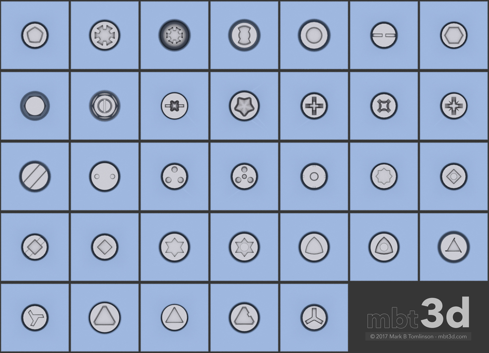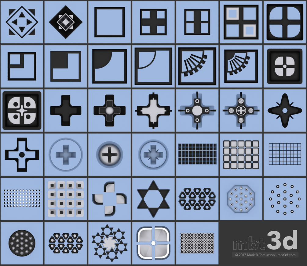 A complete set of over 110 Boolean cutters including bolt, tube, radial, cog, grid, cross and box cutters for use with Modo Mesh Ops and the MOPS Booleans kit.